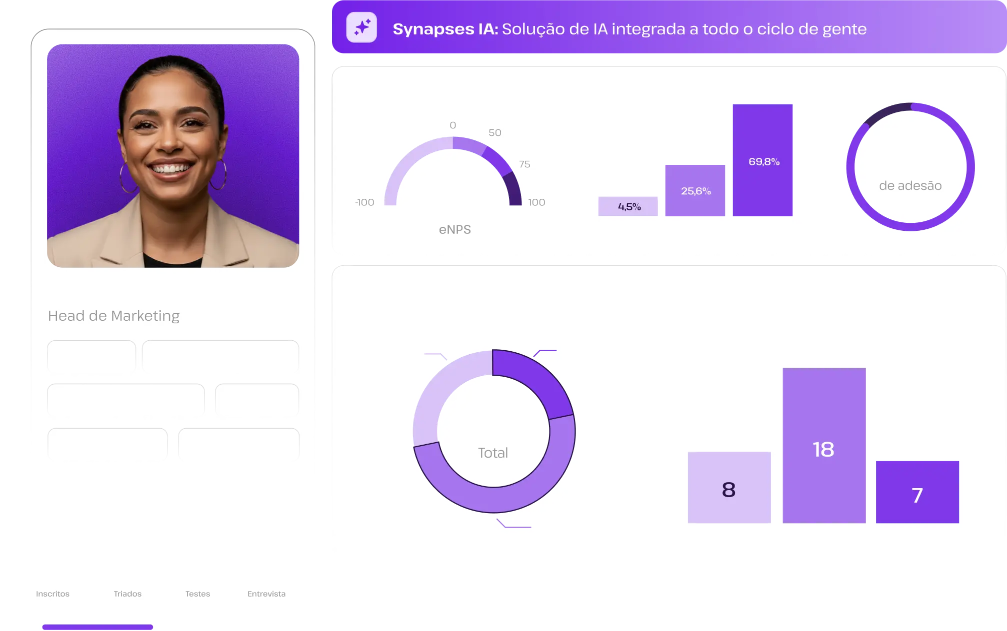 Desde o recrutamento até o desenvolvimento e tomada de decisão sobre pessoas. A Synapses é a IA que agrega valor em todas as etapas do ciclo de gente, de ponta a ponta.